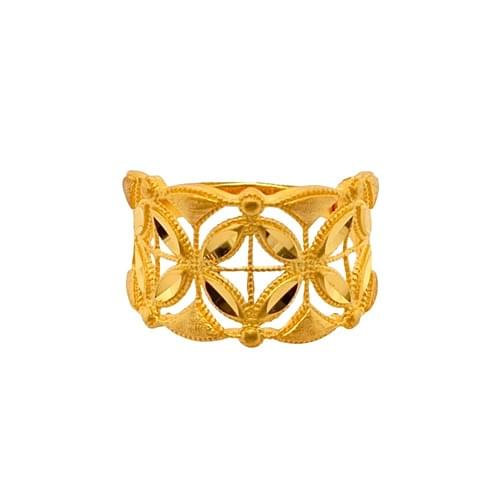 古法金工藝呈現溫潤霧面質感,寬面五帝錢鏤空設計勾勒出古風韻味與現代線條的平衡。這款 古法金五帝錢黃金女戒 融合招財納福的吉祥寓意與設計感,不流於傳統,卻保留文化深意,適合日常佩戴,也是一份象徵祝福與好運的選擇。