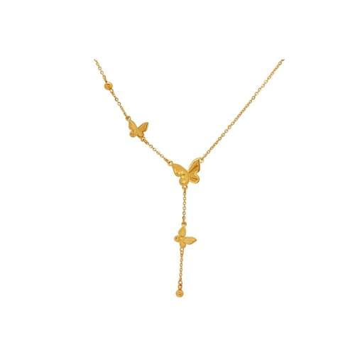 Y字交叉處的大蝴蝶造型精緻搶眼,線條上各有小蝴蝶點綴,搭配碎碎冰工藝閃耀光澤,增添俏皮動感。這款 Y字蝴蝶黃金項鍊 將甜美設計與精巧工藝融合,既適合日常佩戴,也可作為小巧心意禮物,為頸間帶來靈動亮點。